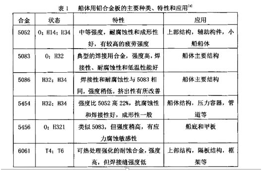 具體到船體部分常用的合金種類及其應(yīng)用來說,有5052鋁板、5083鋁板、5086鋁板、5454鋁板、5456鋁板、6061鋁板,5052鋁板主要用于上部結(jié)構(gòu),輔助構(gòu)件,小船船體,5083、5086鋁板用于船體的主要結(jié)構(gòu),5454鋁板用于船體結(jié)構(gòu),壓力容器,管道等,6061鋁板主要用于上部結(jié)構(gòu),隔板結(jié)構(gòu),框架等。具體的應(yīng)用情況如圖: