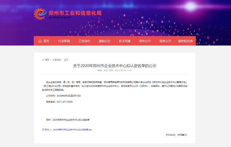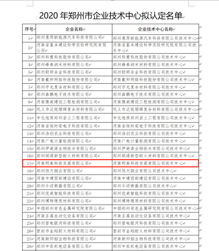 2020年8月4日,經(jīng)企業(yè)自主申報、縣(市、區(qū))推薦、專家評審和現(xiàn)場核查,河南明泰科技發(fā)展有限公司等61家企業(yè)符合《鄭州市認定企業(yè)技術(shù)中心管理辦法》(鄭工信[2014]2號)所規(guī)定的基本條件,擬認定為2020年度鄭州市企業(yè)技術(shù)中心,鄭州市工業(yè)和信息化局將名單予以公示。